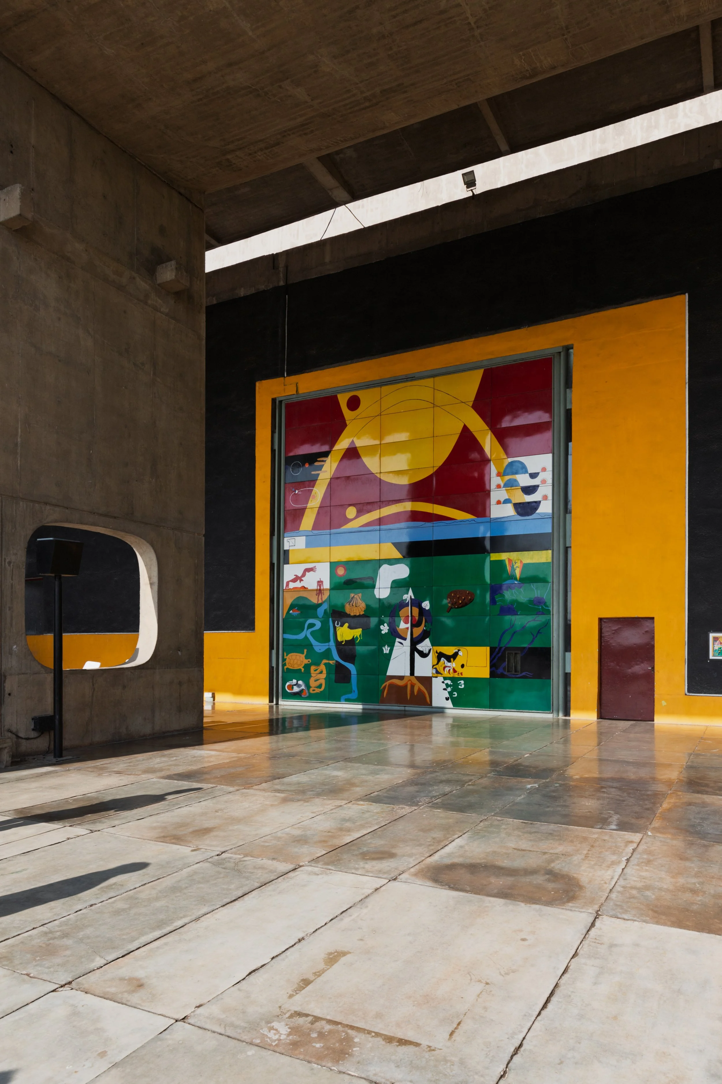Amid the austere concrete grey, Corbusier included the odd splash of vivid colour. He made the enamel door to the Palace of Assembly depicting, beneath a tree of life, the architectural team portrayed as animals. Corb is the crow. Maxwell Fry is suckling on the teat of Jane Drew in the form of a goat. Fry was not entirely happy with this image. Indeed, he was rather sceptical of the entire project.
